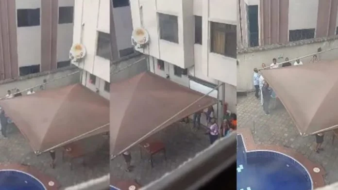 Urenna shared a video she recorded from her window showing lodgers doing the morning devotion under a tarpaulin by the pool side.